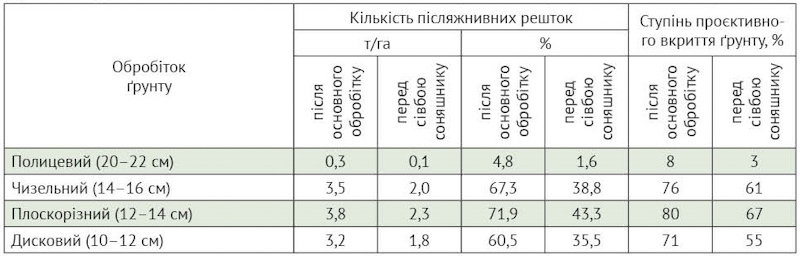 Забезпечення високого ступеня збереження рослинних решток і вкриття ними поверхні протягом осінньо-весняного періоду реалізується за допомогою зяблевого плоскорізного та чизельного обробітків ґрунту (таблиця).