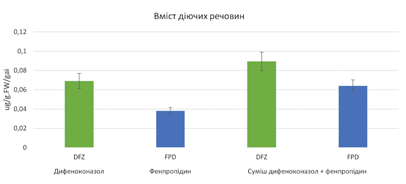 Поєднання дифеноконазолу й фенпропідину допомагає підвищити ефективність проникнення і поглинання рослиною обох д. р., а отже, покращити їх ефективність, про що свідчать отримані результати досліджень (рис. 1). Так, за результатами аналізу на початкове утримання д. р., була помічена тенденція до підвищення їх умісту в тканинах рослин за умови застосування дифеноконазолу та фенпропідину в баковій суміші на противагу застосуванню діючих речовин соло в тих самих кількостях.