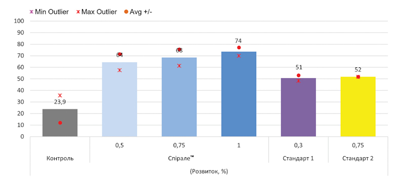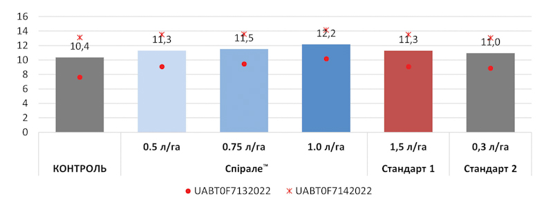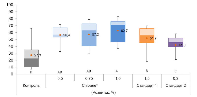 Так, за виходом цукру (т/га) стандарти (триазол + стробілурин), що застосовували в досліді, згідно з результатами статистичного аналізу, відповідали мінімальній нормі Спірале™, тоді як максимальна норма Спірале™ забезпечила вірогідно вищий вихід цукру з гектара. Крім ефективності проти церкоспорозу також можна навести безліч даних щодо ефективності Спірале™ й проти інших збудників хвороб, як от рамуляріоз, борошниста роса чи іржа, що були отримані за результатами дослідів, закладених у країнах ЄС. Однак церкоспороз — найпоширеніша хвороба на території нашої країни, й ефективність фунгіциду проти цієї складної хвороби є визначальною для отримання добрих урожаїв.