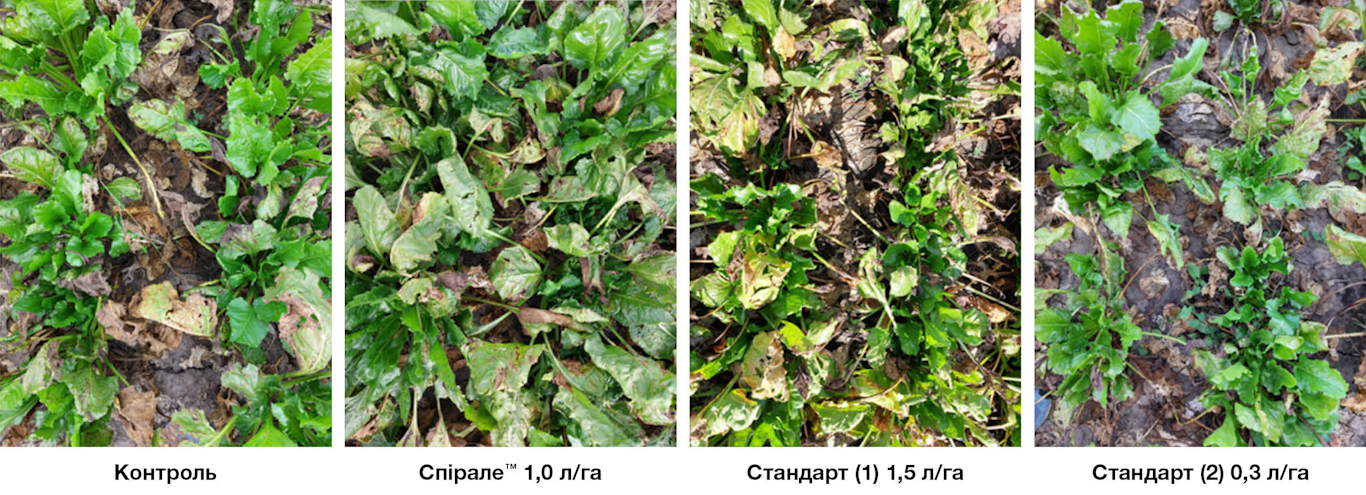 Фото 1. Ефективність фунгіцидів проти церкоспорозу на 42–49-й день після обробки