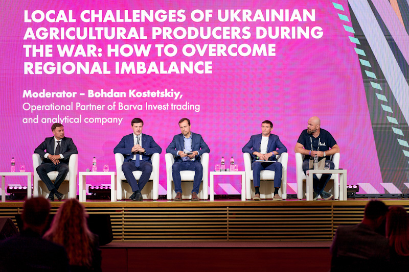 Окрім зовнішніх викликів, українські агровиробники змушені долати труднощі, спричинені повномасштабним вторгненням росії в Україну. Серед найбільш відчутних локальних викликів українського агросектору є дисбаланс розвитку регіонів. Модеруючи цю панельну дискусію, Богдан Костецький, операційний партнер торговельно-аналітичної компанії Barva Invest, що фермерам на прифронтових територіях доводиться працювати попри пошкоджену землю та інфраструктуру — зокрема за підсумками 2023 року постраждало 36% довоєнних зернових площ, кожен четвертий аграрій скоротив виробництво, а 1/3 компаній покинула ринок.