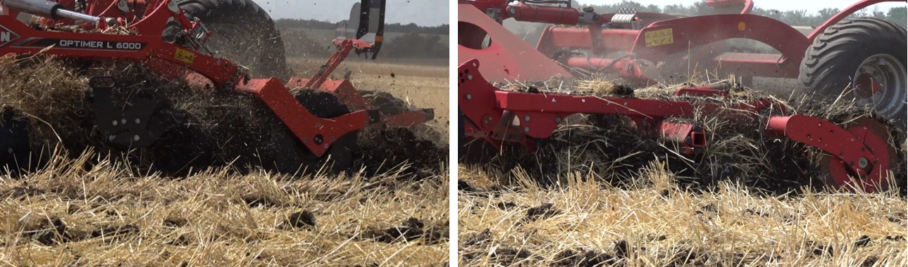 Велика відстань поміж переднім і заднім рядами дискових батарей сприяє якіснішій роботі агрегата, а також гарантує вільне проходження пожнивних решток незалежно від їх кількості та погодних умов, що й було продемонстровано у цьому разі. Самі колеса в конструкції KUHN Optimer L 6000 інтегровано в раму, що складається з трьох частин і захищає від розбалансування та додаткових навантажень.