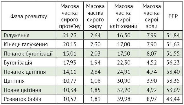 Таблиця 1. Уміст основних поживних речовин у зеленій масі еспарцету в різні фази розвитку, % у перерахунку на абсолютно суху речовину
