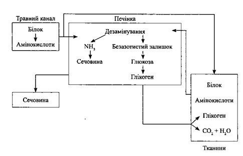 Перший етап. У травному каналі відбуваються процеси розщеплення білків до амінокислот, унаслідок функціонування ферментативних систем, а також їх подальше всмоктування в кров. Амінокислоти транспортуються через епітеліальну стінку кишківника і надходять через ворітну вену в печінку, де частина їх затримується і трансформується, а частина переноситься до різних органів і тканин. Усмоктування амінокислот у кишківнику — енергозалежний процес, що потребує витрат АТФ.