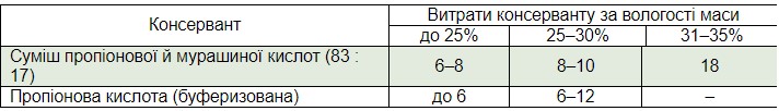 Застосування буферизованих хімічних консервантів знижує ризик повторного мікробіального й токсикологічного забруднення корму і гарантує отримання якісного сіна навіть за повторного зволоження сировини. Для хімічного консервування сіна підвищеної вологості застосовують органічні кислоти та їх композиції (табл. 1).