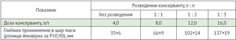 Таблиця 2. Глибина проникнення кислотного консерванту за різного розведення й дози внесення