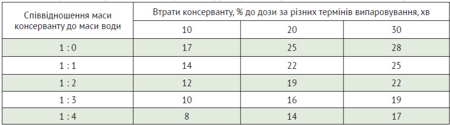 Втрати рідких консервантів від випаровування після внесення в шар рослинної маси визначається методом моделювання в спеціальних місткостях. Кількість консерванту, що випаровувався, і води (з контрольних зразків) визначається шляхом титрування зразків. Дослідження, проведені з мурашиною кислотою (концентрація — 98%, доза — 4 л/т) за температури +21…+22 °С показали, що втрати консерванту за обробки рослинної маси з поверхні шару методом розбризкування складають значну величину через 10 хв після внесення. Після 50 хв суттєвого збільшення втрат не відбувається. Максимальна інтенсивність випаровування відбувається в період до 30 хв. Для зниження втрат консерванту його розводять водою, це особливо актуально за високої температури повітря влітку. У табл. 3 наведено середні значення втрат хімічного консерванту. Відхилення від середніх величин досягали ±20%.