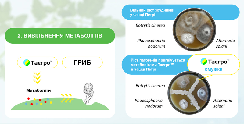 Саме тому у відповідь на потреби ринку компанія «Сингента» представляє інноваційний біологічний фунгіцид Таегро™. В основі цього препарату — унікальний штам Bacillus amyloliquefaciens FZB24, який належить до високоефективних бактерій проти гнилей, борошнистої роси, альтернаріозу, фітофторозу, бактеріальних хвороб на різних овочевих і садово-ягідних культурах. Штам FZB24 з погляду характеристик істотно вирізняє Таегро™ з-поміж інших рішень на ринку. Завдяки продукуванню «штамспецифічних» ліпопептидів і полікетидів, що мають потужну супресивну дію проти широкого спектра шкодочинних грибів і бактерій, Таегро™ забезпечує надійний захист рослин і сприяє підвищенню їхньої стійкості до патогенів.