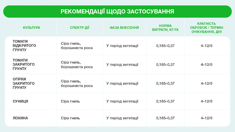 • Контактна і профілактична дії на збудника сірої гнилі (Botrytis cenerea);