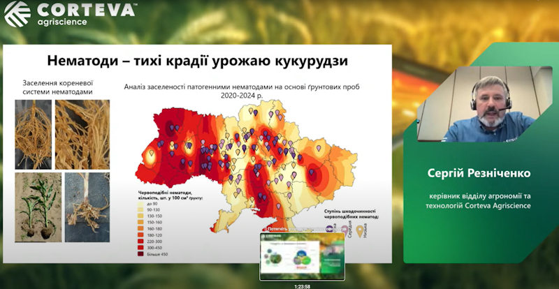 Така хвороба як несправжня борошниста роса може призвести до повної загибелі рослин. Постійно з'являються її нові раси, але ми маємо відповідь – це препарат Лумісена®. Продукт абсолютно новий, з'явився буквально декілька років назад. Він захищає вже не лише від старих рас, а й від нових і дуже суттєво доповнює генетичну стійкість. Зараз багато сільгоспвиробників звертають увагу на такого шкідника як патогенні нематоди. В першу чергу, це стосується цукрових буряків та овочевих культур. Як виявляється, він вражає і кукурудзу. В принципі можна від нього захиститися на початкових стадіях, коли рослина найбільш вразлива. Для цього маємо препарат Луміальза®, який є найекологічнішим рішенням для контролю нематоди. Він біологічний (природна ґрунтова бактерія) та забезпечує надійний ранній захист від паразитичних нематод впродовж перших 80 днів», – розповів керівник з агрономії та розвитку технологій Corteva в Україні Сергій Резніченко.