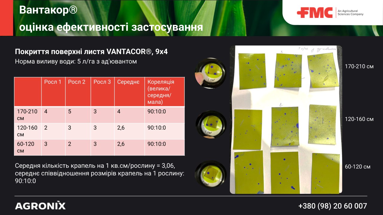 Тому для дослідження обрали норму 6 л/га, порівнюючи Вантакор® з відомим препаратом Кораген®, який уже має авіаційну реєстрацію в Україні. Незважаючи на неідеальні умови, перші результати вразили: більший відсоток крапель з Вантакором® досягав рівня качана, і в результаті ефективність препарату виявилася вищою, ніж у Корагену®. Це стало приводом для глибшого аналізу.