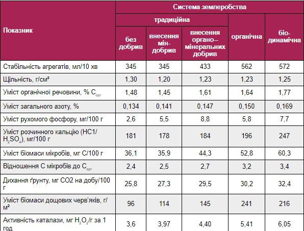 Про високу ґрунтовідновлювальну ефективність біодинамічного землеробства свідчать результати досліджень, проведених у тривалому стаціонарному досліді на бурому лісовому важко-суглинковому ґрунті поблизу швейцарського міста Базеля (таблиця).