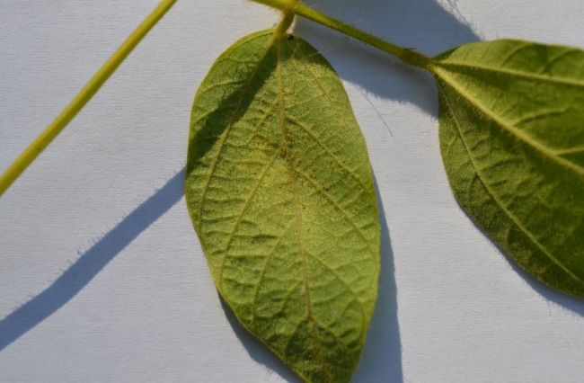 Рис. 2а. Листки сої, уражені звичайним павутинним кліщем