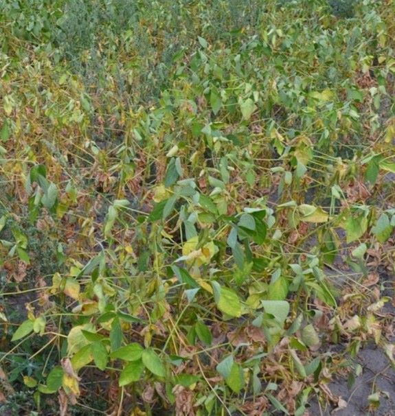 Рис. 2б. Рослини сої, уражені звичайним павутинним кліщем