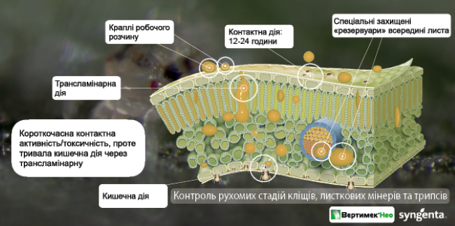 На відміну від більшості специфічних акарицидів, які є переважно контактними, препарати Вертимек® 018 ЕС, КЕ та Вертимек® Нео 018 SL, РК від компанії «Сингента» мають контактну, кишкову і також виражену трансламінарну дії. Абамектин (їхня діюча речовина) легко проникає через верхній епідерміс і переміщується у міжклітинному просторі від верхнього боку листка до нижнього, зовні якого якраз і зосереджені кліщі. Тож, власне, кишкова дія у цієї активної сполуки виявляється завдяки її можливості спочатку трансламінарно проникати в органи рослин та токсикувати їх; і вже після цього вона потрапляє в організми кліщів у момент їхнього живлення (рис. 3).