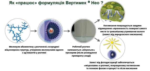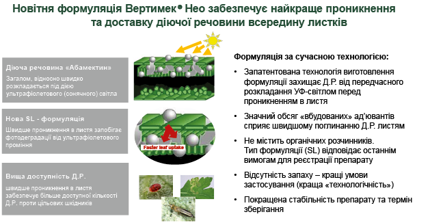 Таким чином, названі вище типи ад’ювантів, що входять до складу новітньої формуляції Вертимек® Нео, забезпечують різносторонній та комплексний захист діючої речовини від фотодеструкції, сприяють тривалішому й ефективнішому її поглинанню всередину мезофілу листя й транспортуванню до нижнього епідермісу. Тобто у SL-формуляції більша кількість абамектину досягає місць локалізації шкідників (кліщів, що живляться на нижньому боці листкових пластинок) і тому стає доступною для них. У підсумку отримуємо підвищення ефективності контролю.