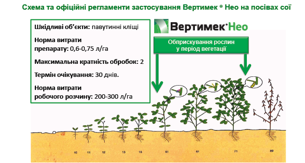 Рис. 7. Схема та офіційні регламенти застосування Вертимек® Нео на посівах сої