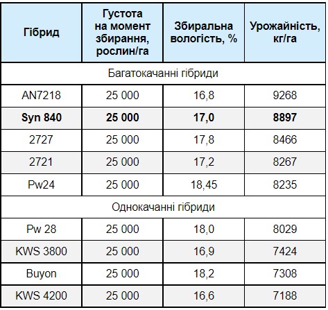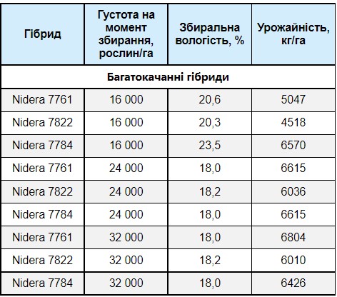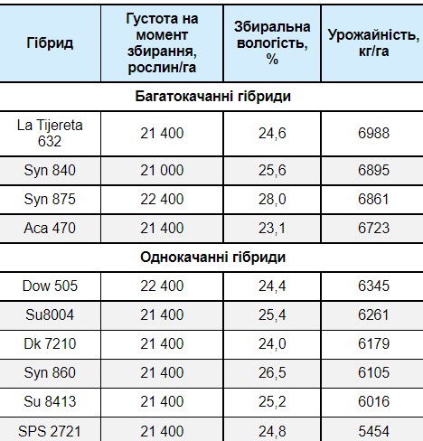 Таблиця 2. Реакція на норми висіву різних гібридів кукурудзи