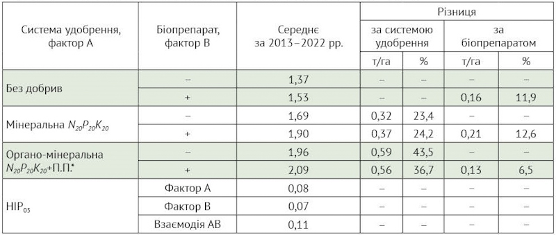 Унесення мінеральних добрив сприяло зростанню врожаю на 0,32 т/га (23,4%), мінеральної системи удобрення з біопрепаратом — на 0,37 т/га (24,2%). Прибавка врожаю завдяки добривам із пожнивними рештками попередника становила 0,59 т/га (43,5%), а на фоні інокуляції насіння за органо-мінеральної систем удобрення — 0,56 т/га (36,7%).
