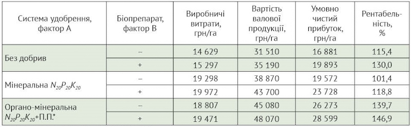 Таблиця 2. Економічна ефективність вирощування гречки залежно від системи удобрення та біопрепарату