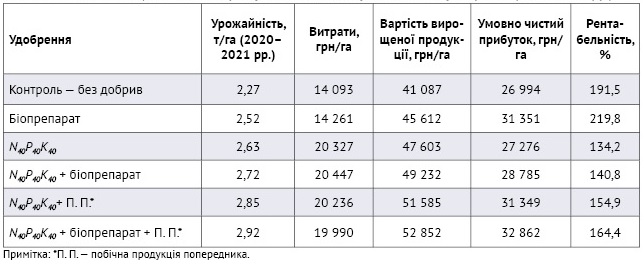 Отже, вищі економічні показники соняшнику були за внесення мінеральних добрив на фоні побічної продукції попередника із застосуванням біопрепарату, що сприяло отриманню найвищого рівня умовно чистого прибутку — 32 862 грн/га за рентабельності 164,4%.