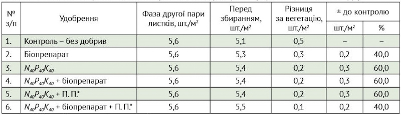 Одною з головних складових урожайності є густота рослин. За період вегетації рослини соняшнику піддаються впливу багатьох негативних факторів, які знижують густоту рослин, які зійшли і призводять до недобору урожайності. Нашими дослідженнями встановлена залежність виживаності рослин соняшнику від добрив та від інокуляції насіння мікробним препаратом (табл. 1). Сформована, після отримання повних сходів у фазу утворення рослинами соняшнику першої пари листків, густота рослин на рівні 5,6 шт./м² змінювалася у контрольному варіанті без добрив на 0,5 шт./м² , тоді, як лише за інокуляції посіви втрачали 0,3 шт./м² , при внесенні мінеральних добрив та за їх взаємодії з мікробним препаратом та із побічною продукцією зменшувався показник виживаності на 0,2 шт./м² . Найменші втрати рослин протягом життя були у варіанті з органічними та мінеральними добривами з використанням біопрепарату а рівень загибелі не перевищував 0,1 шт./м². Встановлено, що вказані показники, у відсотковому співвідношенні, порівняно до варіанту без добрив становили 0,2 шт./м² за умов використання біопрепарату окремо та у взаємодії з мінеральними добривами з органічною речовиною попередньої культури.