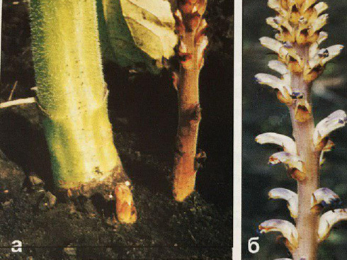 Вовчок соняшниковий: а — поява пагонів на поверхні ґрунту: б — суцвіття.