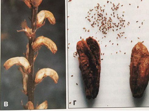 Вовчок соняшниковий: в-пагін у стадії дозрівання; г — коробочки і насіння