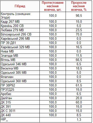 Таблиця 1. Проростання насіння вовчка під дією кореневих виділень гібридів кукурудзи