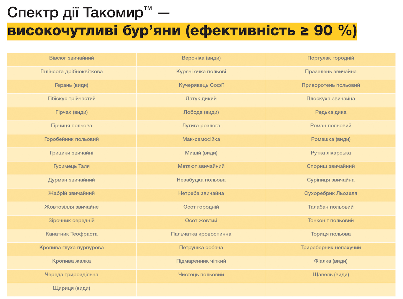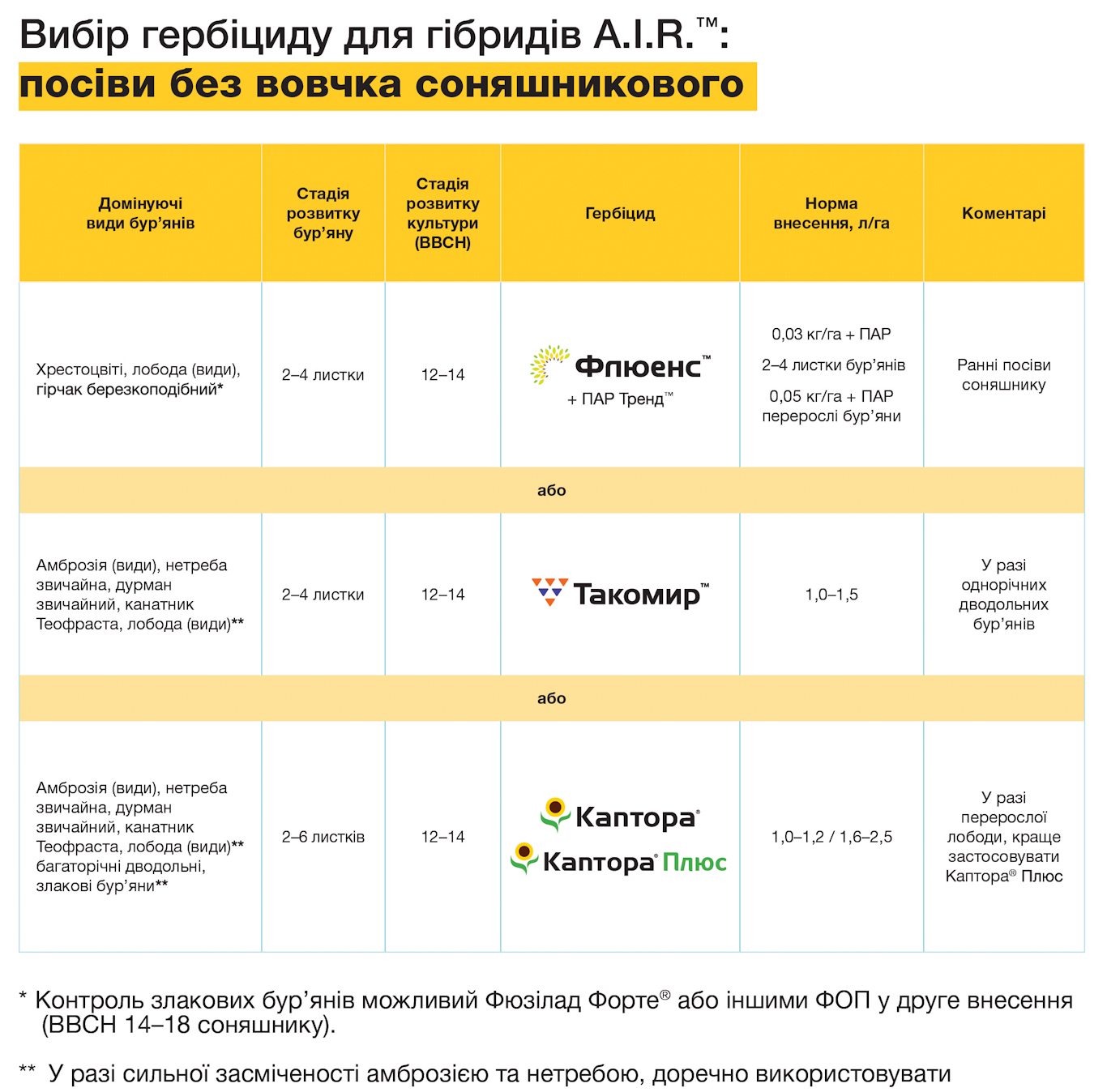 Ще раз хотілося б звернути вашу увагу на те, що для захисту гібридів A.I.R.™ ми пропонуємо застосовувати ґрунтові гербіциди, такі як Примекстра® ТZ Голд та суміш Дуал Голд® із Гезагард®, а за післясходової обробки — гербіциди з імідазолінонової групи Каптора®, Каптора® Плюс і Такомир™. Також на цих гібридах, зважаючи на видовий склад бур’янів, можливе застосування гербіциду Флюенс™ + ПАР (Тренд™). Кілька слів треба сказати про гербіцид Такомир™, який складається з імазамоксу (40 г/л). Це звичайний імазамокс соло, дозволений до використання на гібридах A.I.R.™, що контролює однорічні злакові та дводольні бур’яни, а також частково вовчок (за незначної засміченості в посівах соняшнику). На відміну від потужніших гербіцидів Каптора® та Каптора® Плюс, Такомир™ спрямований на боротьбу з поширенішими однорічниками: нетребою звичайною, амброзією полинолистою, лободою, канатником Теофраста тощо — і має меншу післядію у сівозміні.