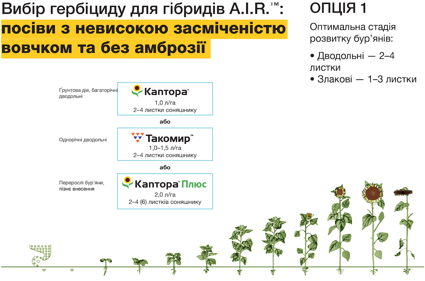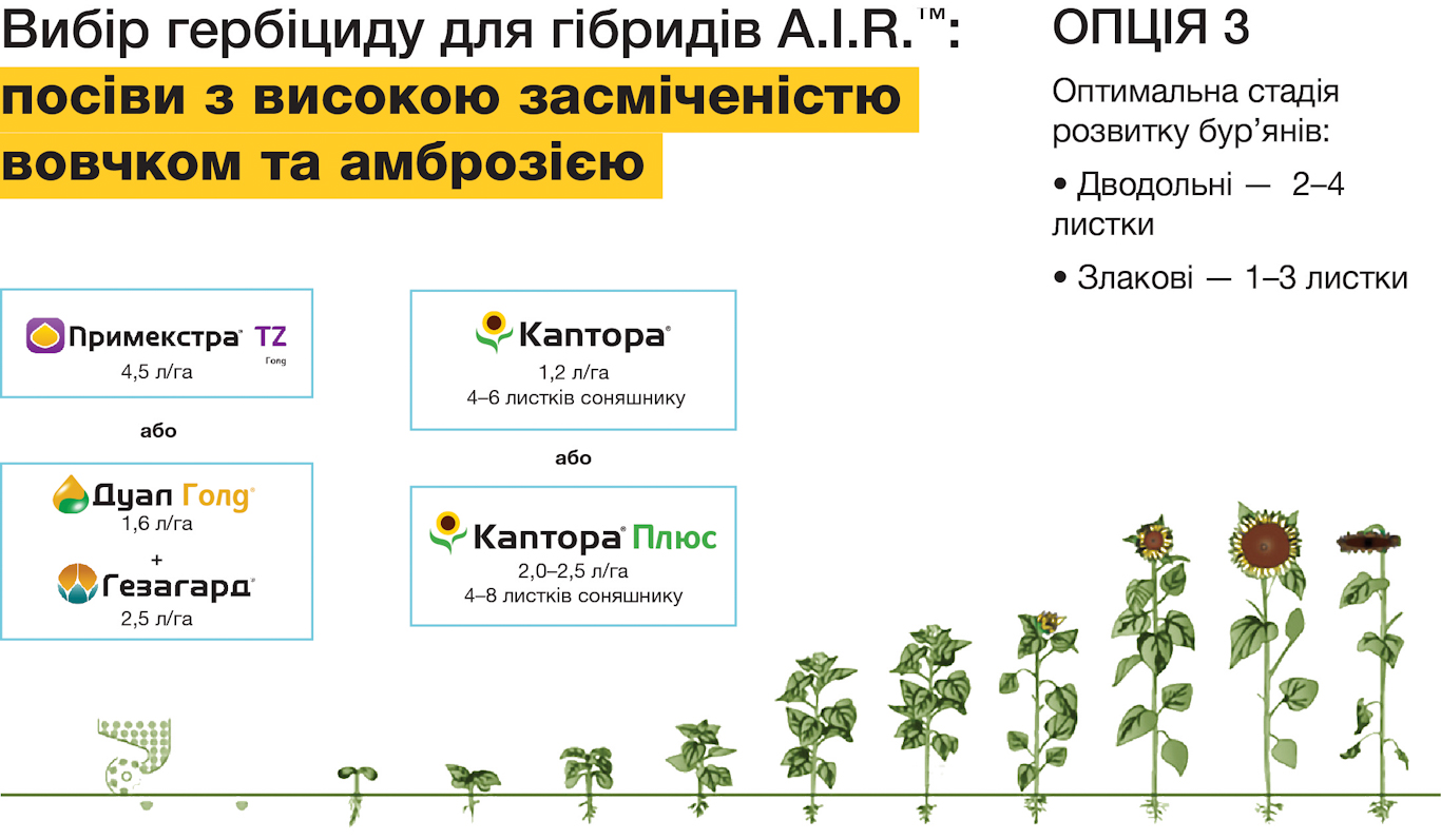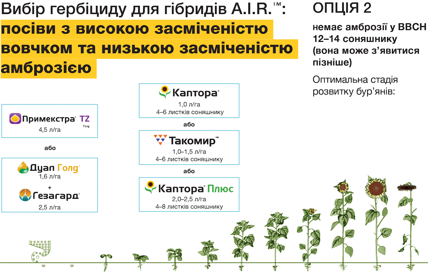 А тепер розглянемо опції щодо гербіцидного захисту посівів гібридів A.I.R.™ соняшнику в тих випадках, коли на полях є вовчок соняшниковий. Перша опція — стандартна, коли ми маємо невисоку засміченість посівів вовчком і практично без амброзії (див. Опція 1). Що означає невисока засміченість вовчком: вовчок соняшниковий тільки з’являється у посівах, а амброзія представлена поодинокими рослинами на полі. В таких випадках ми рекомендуємо застосовувати, зважаючи на забур’янення, гербіцид Каптора® (1,0 л/га) чи Каптора® Плюс (2,0 л/га) або Такомир™ (1,0–1,5 л/га). Звісно, Опція 1 не є панацеєю, доречнішою і найпоширенішою є Опція 2, коли посіви мають високий ступінь засмічення вовчком соняшниковим та низький — амброзією у післясходовий період вирощування соняшнику. У такому разі стане в пригоді застосування ґрунтових гербіцидів Примекстра® ТZ Голд (4,5 л/га) або суміші Дуал Голд® (1,6 л/га) + Гезагард® (2,5 л/га), які закриють питання з бур’янами в досходовий період, особливо з амброзією, що, однак, може з’явитися пізніше й буде проконтрольована імідазоліноновою групою. Проте найголовніша перевага Опції 2 — це можливість попрацювати саме по вовчку в оптимальний для його розвитку період. Інакше кажучи, ґрунтові гербіциди «забирають» на себе частину бур’янів, дозволяючи внести імідазолінонову групу трохи пізніше, у фазу 4–6 (8) листків соняшнику, залежно від гербіциду. За таких умов препарат Каптора® у нормі 1,0 л/га ми рекомендуємо вносити у фазу 4–6 листків. Те саме стосується гербіциду Такомир™ з нормою 1,0–1,5 л/га, а от Каптора® Плюс може застосовуватися ще пізніше, аж до 8-го листка культури з нормою 2,0 л/га. Опція 2, нагадаємо, є найпоширенішою та найефективнішою з усіх трьох опцій. Щодо Опції 3, то вона відрізняється від Опції 2 головним чином тим, що Каптора® чи Каптора® Плюс рекомендуються до застосування у максимальних нормах витрати, коли ми маємо високий ступінь засмічення як вовчком соняшниковим, так і амброзією. Водночас в Опції 3 відсутній Такомир™, адже за високої забур’яненості він уже не здатний проконтролювати бур’яни й має набагато меншу ґрунтову дію.