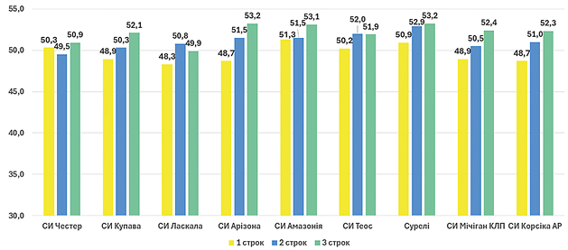 Також зафіксовано вплив термінів сівби на вміст олії в гібридах соняшнику. У гібридів СИ Купава, СИ Арізона, СИ Амазонія, СИ Теос, Сурелі, СИ Мічіган КЛП, СИ Корсіка АР вміст олії стабільно збільшувався за зміщення термінів від ранніх до пізніх оптимальних. Різниця в олійності між раннім і пізнім оптимальним сягала в гібрида СИ Арізона 4,5 %, у гібрида СИ Корсіка АР — 3,6% (рис. 3).