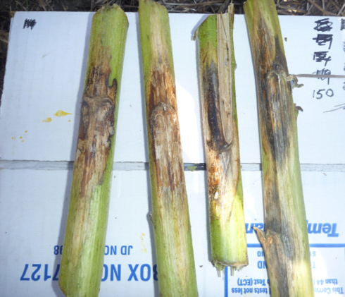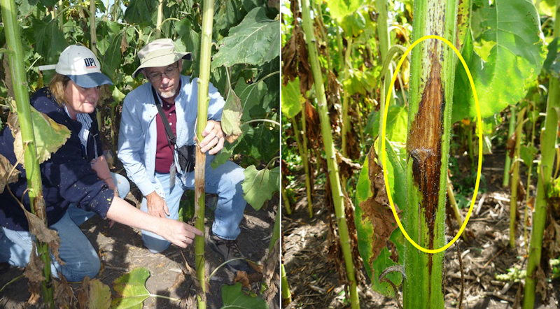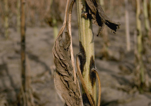 Фактично ця хвороба — близнюк фомозу. Чим вони принципово відрізняються? Фомоз утворює плями чорного кольору, що розміщуються на поверхні. Фомопсис має плями бурого кольору, що глибоко проникають у стебло, утворюючи отвір. Через це рослини соняшнику вилягають. Ще одна принципова відмінність: фомопсис завжди розвивається у вигляді бурих трикутних плям, які дуже швидко дістаються центральної жилки. Чому він розвивається так? Тому що він потребує більшої кількості вологи. Відповідно, він інфікує листок, коли проростає у найбільшій за розміром краплі. А найбільша крапля розташовується на нижньому гострі листка, куди стікає вся волога.