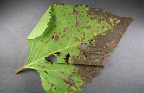 Як розпізнати фомоз на листі? Він завжди проявляється у вигляді некрозу бічної поверхні листка. Тобто некротичні плями йдуть від краю листків до центральної частини, потім до жилки, черешка і стебла.