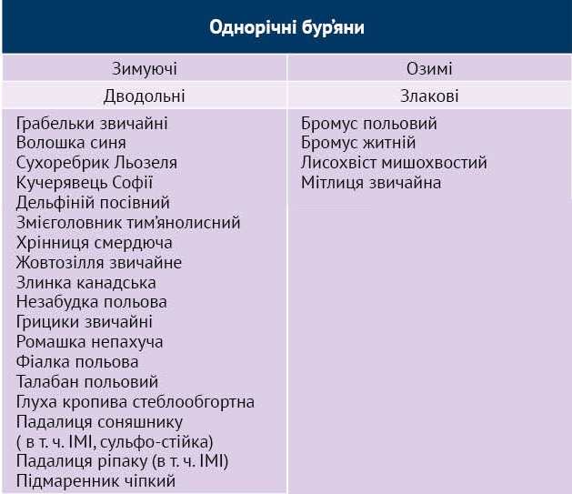 Передусім варто сказати про те, що ми в Україні маємо цілу низку зимуючих та озимих бур’янів (табл. 1), які сходять восени в посівах зернових, успішно перезимовують та закінчують свою вегетацію в наступному році, тобто за біологією свого розвитку подібні до озимих зернових культур. Серед них такі начебто звичайні й усім відомі бур’яни, як талабан польовий, дескурайнія (кучерявець) Софії, хрінниця звичайна, сокирки польові, волошка синя, а також більш складні, як от фіалка польова, ромашка непахуча, глуха кропива (види) тощо. Останніми роками через насичення сівозмін соняшником його падалицю різних типів також можна віднести до зимуючих бур’янів, до того ж волога осінь і тепла зима сприяють її вдалій перезимівлі. Серед озимих (злакових) бур’янів на більшій частині площ озимих зернових в Україні найшкодичиннішим є метлюг звичайний. Таким чином, за спектром бур’янів, які сходять з осені, бачимо, що потрібен гербіцид із так званим крос-спектром ефективності, тобто такий, який може контролювати і злакові, і дводольні бур’яни.