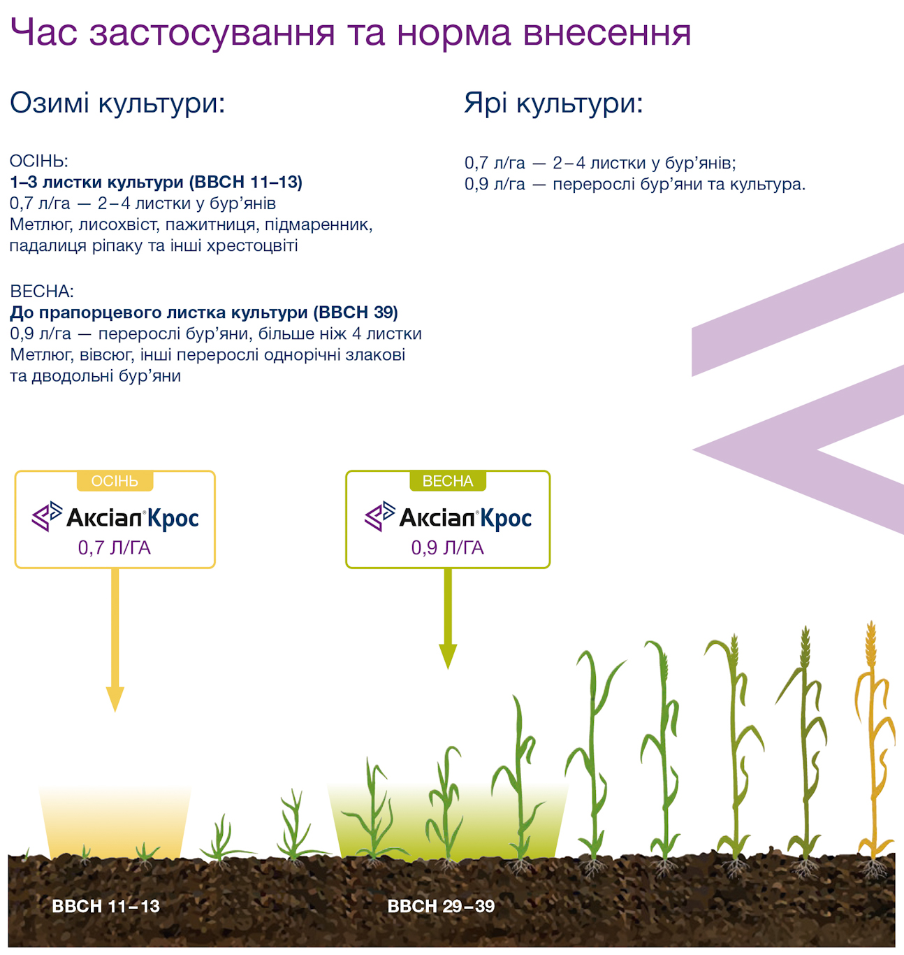 Крім усього вищеперерахованого, варто додати, що Аксіал® Крос чудово контролює традиційну, ІМІ та сульфо-падалицю соняшнику, а також ІМІ-падалицю ріпаку. Також треба нагадати про температурний режим використання Аксіал® Крос, а саме: його можна вносити у температурному діапазоні від +5 до +25 °С. Тобто, як бачимо, нижній поріг температури у +5 °С не впливає на його ефективність, що дуже важливо при осінньому та ранньовесняному застосуванні. Короткочасні нічні приморозки також не позначаться на дії гербіциду, але, якщо температура опускається нижче ніж +5 °С і фактично тримається на такому рівні декілька діб, Аксіал® Крос вносити не рекомендується, адже за таких умов він може не проявити своєї ефективності, як і будь-який післясходовий гербіцид.