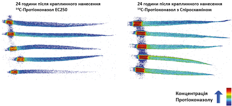 Через 24 години після краплинного нанесення суміш протіоконазол + спіроксамін продемонструвала на 36 % більше покриття листової пластинки ніж протіоконазол у соло