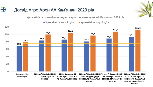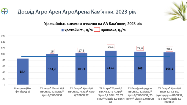Тепер підбиймо підсумок результатів по врожайності за різними системами захисту: як бачимо на АгроАрені Захід, ми отримали максимальну врожайність озимої пшениці 111,6 ц/га, прибавка до контролю становила 33,4 ц/га. Озимий ячмінь продемонстрував урожайність 111,5 ц/га, прибавка — 26,1 ц/га.