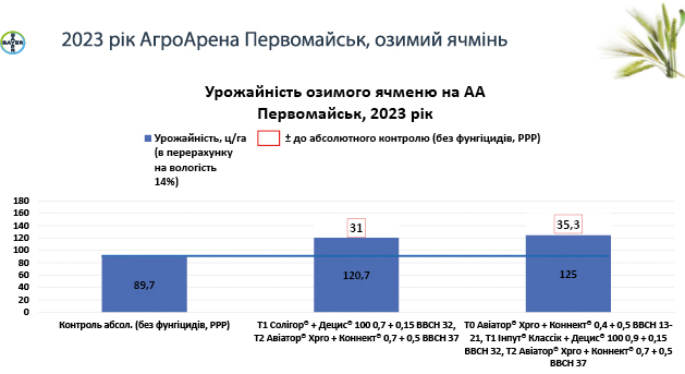 Ну, і тепер про самий рекордний показник урожайності на наших АгроАренах — його було отримано на АгроАрені Первомайськ, де озимий ячмінь зібрали з показником 125 ц/га. Прибавка до контролю — 35,3 ц/га. Який секрет успіху? Попередник — горох, осінній фунгіцидний захист і повний весняний захист. Щодо мінеральних добрив — усього було застосовано мінеральних добрив, включно з основним унесенням та підживленням — N108P30К17S56 Норма висіву — 2,0 млн штук схожих насінин на гектар. Глибина загортання насіння — 2,5–3 см Ширина міжрядь — 12,5 см. Дата отримання повних сходів — 03.10.2022. Це основні моменти з технології. Підбиваючи підсумок: можливість реалізації максимального потенціалу врожаю — сьогодні вже цілком досяжна мета, проте тільки дотримання всіх елементів технології вирощування зернових культур дозволяє розкрити потенціал урожаю. Одним з інструментів отримання прибавки врожаю є застосування безпечних ефективних фунгіцидів із тривалим захистом, якісною формуляцією та позитивним впливом на культуру. Прибавку врожаю часто отримують як результат подовження вегетації культур і збереження площі листкової поверхні.