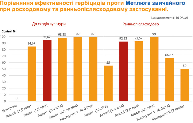 Реєстраційна норма Акваті® на озимій пшениці становить 1,5–2,0 л/га. З такою нормою гербіцид здатний контролювати всього два злакових бур’яни — метлюг звичайний і тонконіг в осінній період. До того ж Акваті®, на відміну від конкурентів, контролює цих два вагомих злаки як ґрунтово, так і ранньопіслясходово, у фазу від 1 до 3 листків культури (ранні стадії розвитку бур’янів) (Графік 1).