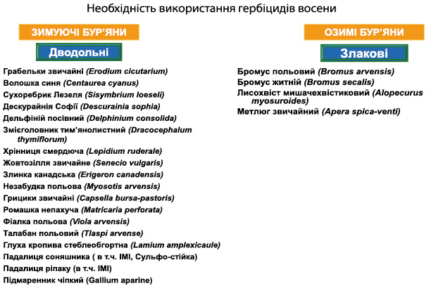Однак відомо, що в посівах озимих зернових ніколи не трапляються тільки злакові бур’яни, тут ми маємо низку зимуючих дводольних видів (табл.1).