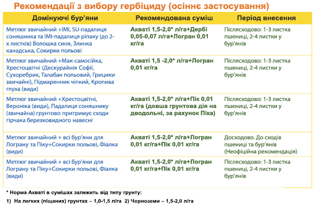 Окремо слід зупинитися на суміші Акваті® + Логран® + Пік® за застосування до сходів культури. Хоча Логран® і Пік® не мають офіційної реєстрації для внесення до сходів культури, результати власних багаторічних дослідів показують, що таке цілком можна робити і вони в цій суміші справляють справжню ґрунтову дію. За додавання до цієї суміші гербіциду Акваті® ми контролюємо практично весь спектр однорічних злакових (окрім видів бромусу) та низку зимуючих дводольних видів бур’янів — наступні хвилі також контролюються. Цією рекомендацією ми вигідно відрізняємось від конкурентів.