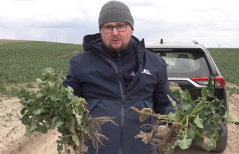 На контрольному полі з ріпаком було внесено Діамофос (NPK) 10 : 26 : 26 кг, а на іншому — Полісульфат 100 кг з Діамофос (NPK) 50 кг. Чому обрали таку технологію? Тому що ґрунти бідні на фосфор, і дати сам Полісульфат без фосфорного добрива було б нераціонально і нелогічно в системі вирощування озимого ріпаку. Якщо подивитися на рослини, то на обох частинах поля вони майже однакові на вигляд весною. Хоча можна помітити й певні відмінності. Там, де був Полісульфат, краще розвинутий габітус ріпаку й більша маса кореневих волосків, завдяки яким рослина може краще споживати мікро- і мезоелементи з ґрунту. Чим більша їх кількість, тим краще перебігатимуть обмінні процеси й краще споживання тих чи інших елементів живлення. На розрізі кореня немає дуплистості, некрозів, а коренева оболонка досить товста, що нівелює ризики проникнення тих чи інших хвороб. Отож це господарство вчасно провело всі операції, тобто рослини забезпечено всім, що потрібно для розвитку. На цій стадії коренева система вже фактично сформована, тому що ріпак з осені закладає її 65%, а з весни — ще 35%. У цьому зразку на 85–90% коренева система вже сформована», — розповів Артем Шатковський.