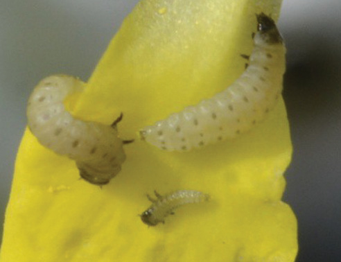 Рис. 4. Личинки ріпакового квіткоїда молодших і старших віків, ННВЦ «Дослідне поле», ІІІ декада червня 2018 р. (фото автора)