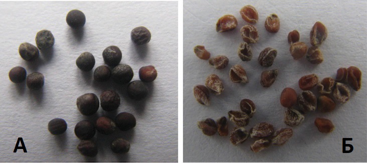 Рис. 5. Насіння ріпаку ярого, непошкоджене (А) та пошкоджене личинками ріпакового квіткоїда (Б) (фото автора)