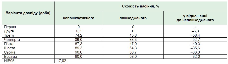 Із даних Таблиці видно, що на першу добу після сівби немає схожості у жодному з варіантів. На другу добу схожість непошкодженого насіння становила 6,3%,пошкодженого – 0, на третю добу схожість непошкодженого насіння ріпаку становила 74,2% проти 15,8% у варіанті з пошкодженим насінням. Схожість непошкодженого насіння на четверту добу після сівби становила 86,0%, пошкодженого – 33,3%. На п’яту добу після сівби схожість непошкодженого насіння була 87,3%,пошкодженого – 47,0%.