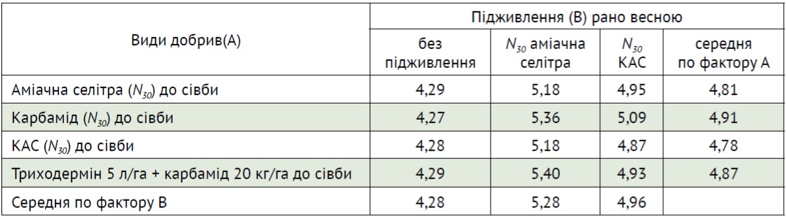 Тобто за вирощування ячменю озимого після стерньового попередника рівень урожаю зерна значно залежить від поєднання осіннього та рано весняного внесення азотних добрив. Так, передпосівне внесення окремо аміачної селітри, карбаміду і КАС в дозах 30 кг/га д. р. та біопрепарату Триходермін (5 л/га) у сумішці 20 кг/га карбаміду дозволило отримати врожайність, що, відповідно, становила 4,29 т/га, 4,27, 4,28 і 4,29 т/га (табл. 2).