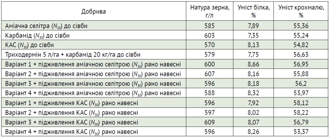 Найбільше білка в зерні — 8,66% — містилося на варіанті, де використовували аміачну селітру — N30 восени і N30 у підживлення рано навесні.