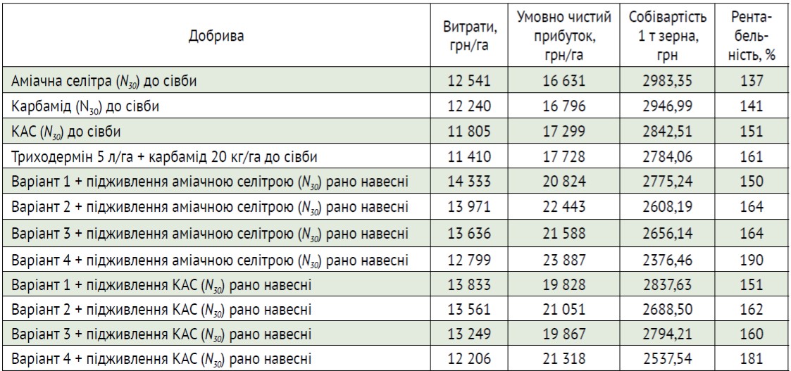 Найкраще поєднання всіх показників економічної ефективності отримано за проведення рано навесні підживлення аміачною селітрою N30 на фоні передпосівного внесення сумішки біологічного препарату Триходермін (5 л/га) з карбамідом 20 кг/га, де отримано найвищий умовно чистий прибуток 23 887 грн/га з рентабельністю 190% за найменшої собівартості зерна 2376,46 грн/т. Застосування на такому самому фоні карбамідно-аміачної суміші (КАС) також забезпечило кращі економічні показники: умовно чистий прибуток становив 21 318 грн/га, собівартість зерна 2537,54 грн/т і рентабельність 181%.
