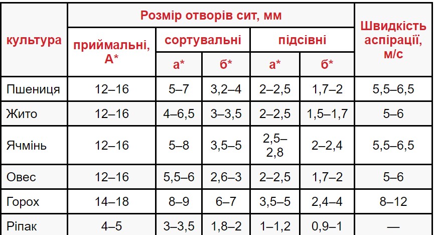 Таблиця 1. Режими очищення-сортування зерна на повітряно-ситових зерносепараторах